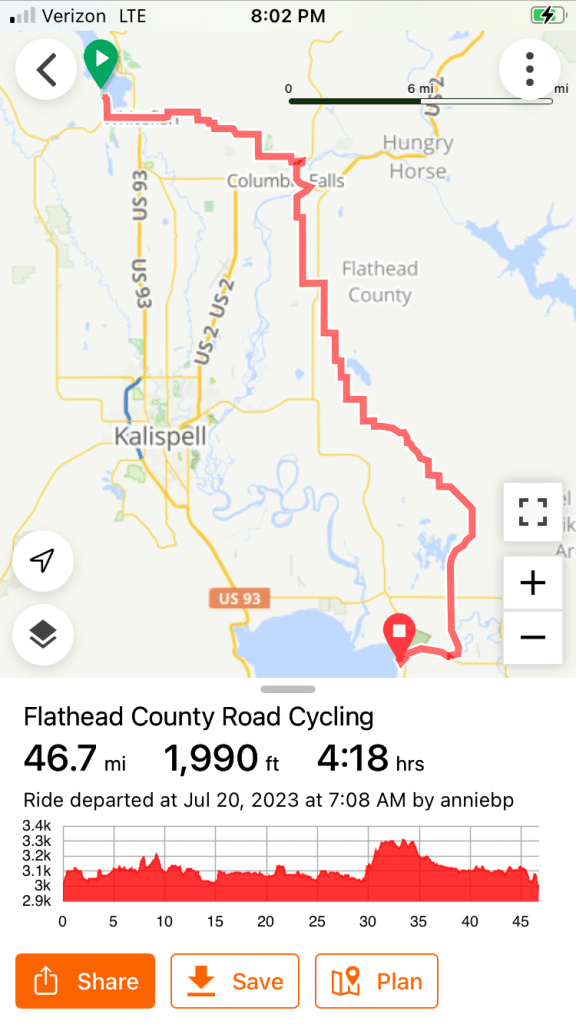 Today we rode mostly on pavement through the towns of Whitefish and Columbia Falls and then on beautiful farm roads.